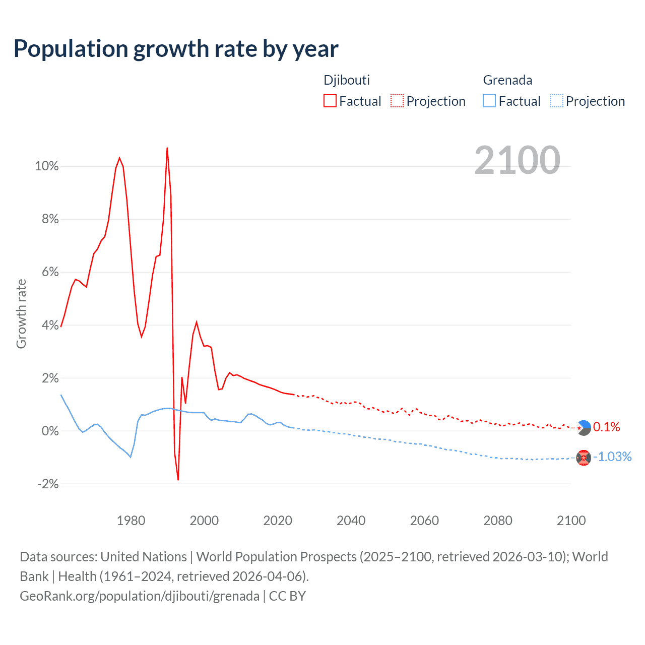 - For the last 10 years, Djibouti has had an average growth rate of +1.57% per year vs +0.29% in Grenada.