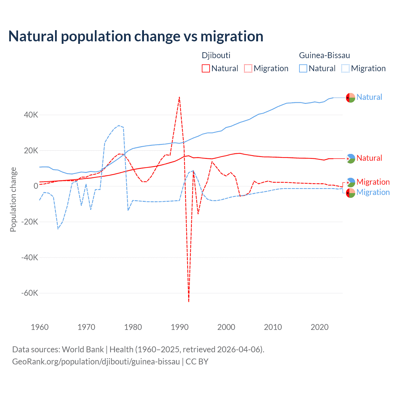 Over the last 10 years, 92.1% of the population change in Djibouti is from natural causes (a gain of 153,892 people) and 7.87% is from migration (a gain of 13,138 people). In Guinea-Bissau 97.1% is from natural causes (a gain of 472,826 people) and 2.87% is from migration (a loss of 13,956 people).