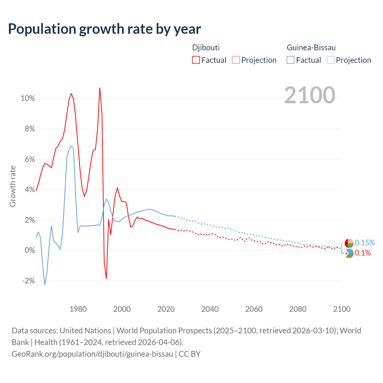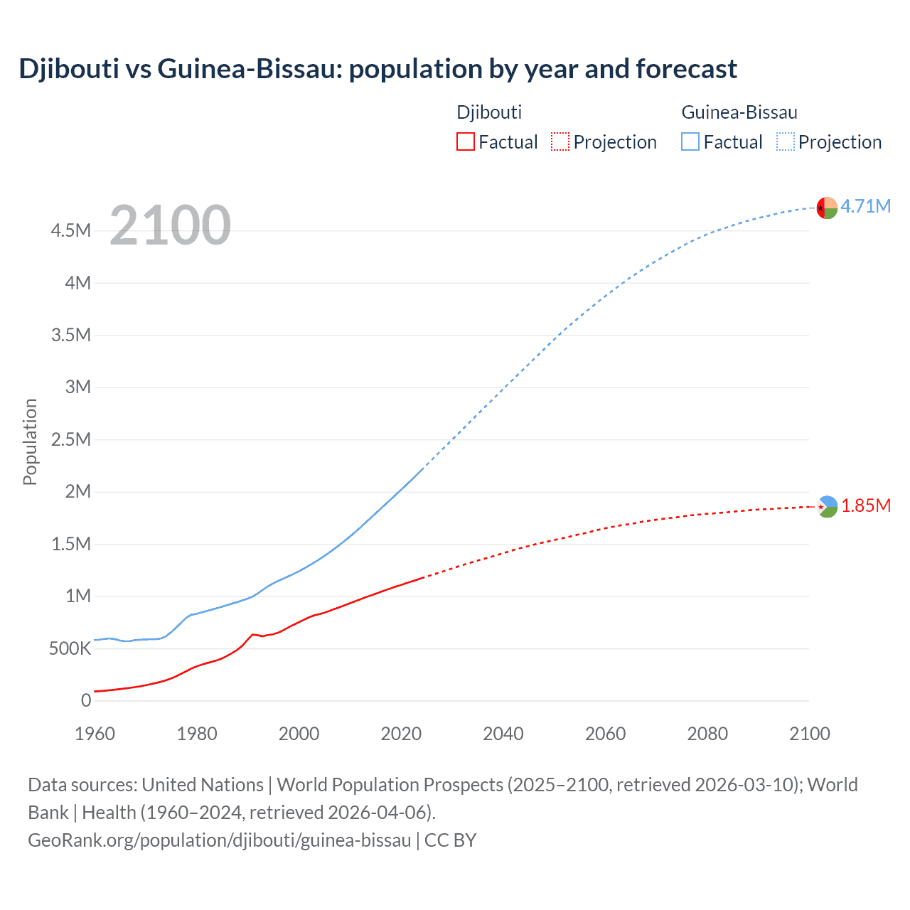 Djibouti vs Guinea-Bissau: population by year and forecast