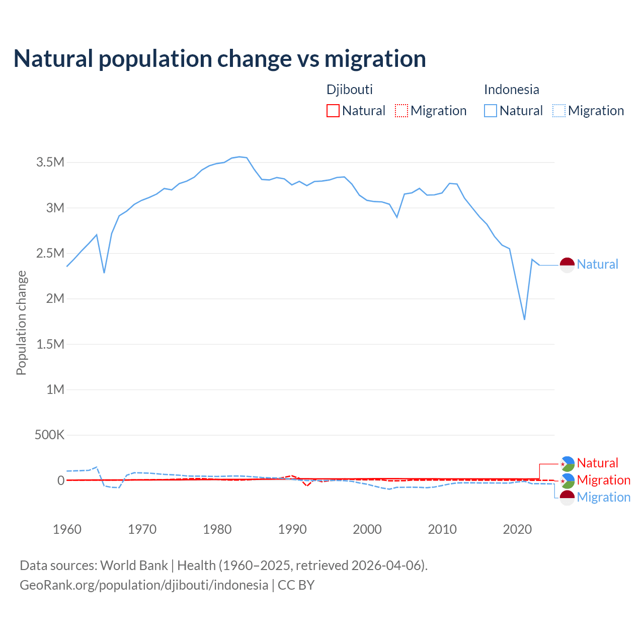 Over the last 10 years, 92.1% of the population change in Djibouti is from natural causes (a gain of 153,892 people) and 7.87% is from migration (a gain of 13,138 people). In Indonesia 98.9% is from natural causes (a gain of 25,242,860 people) and 1.1% is from migration (a loss of 280,258 people).