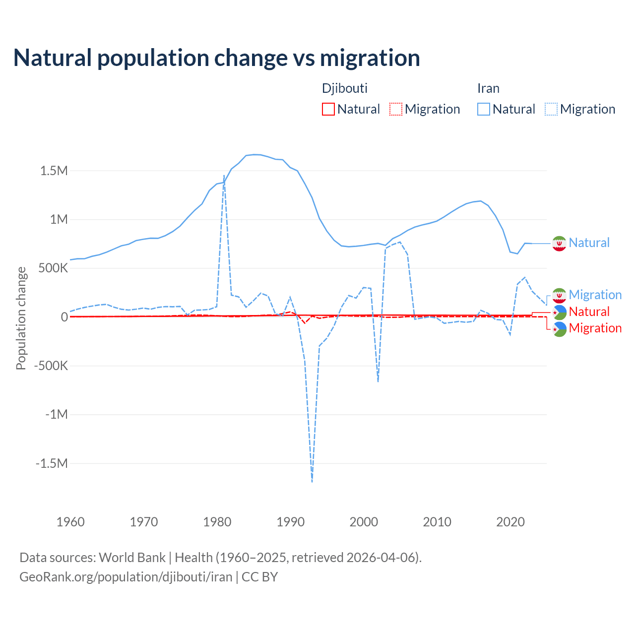 Over the last 10 years, 92.1% of the population change in Djibouti is from natural causes (a gain of 153,892 people) and 7.87% is from migration (a gain of 13,138 people). In Iran 92.5% is from natural causes (a gain of 9,405,860 people) and 7.46% is from migration (a gain of 757,979 people).