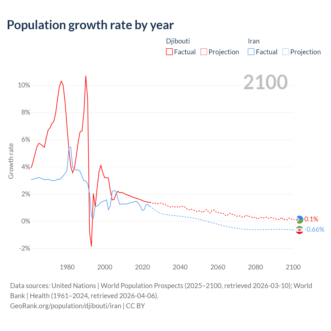- For the last 10 years, Djibouti has had an average growth rate of +1.57% per year vs +1.19% in Iran.
