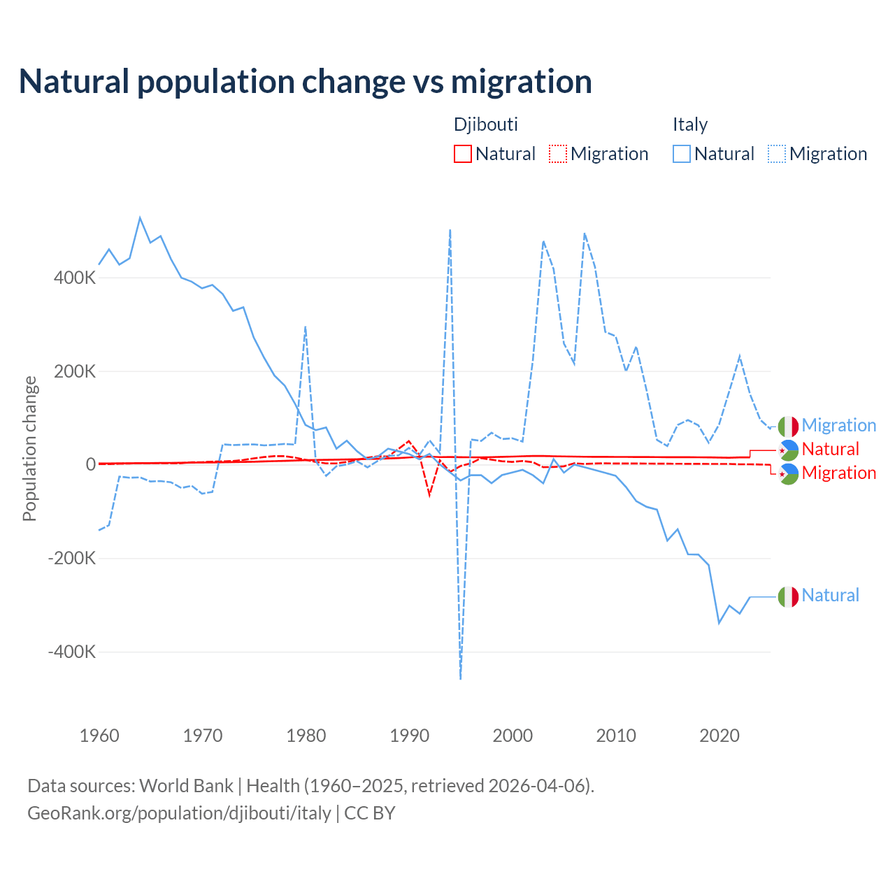 Over the last 10 years, 92.1% of the population change in Djibouti is from natural causes (a gain of 153,892 people) and 7.87% is from migration (a gain of 13,138 people). In Italy 68.6% is from natural causes (a loss of 2,239,084 people) and 31.4% is from migration (a gain of 1,026,128 people).