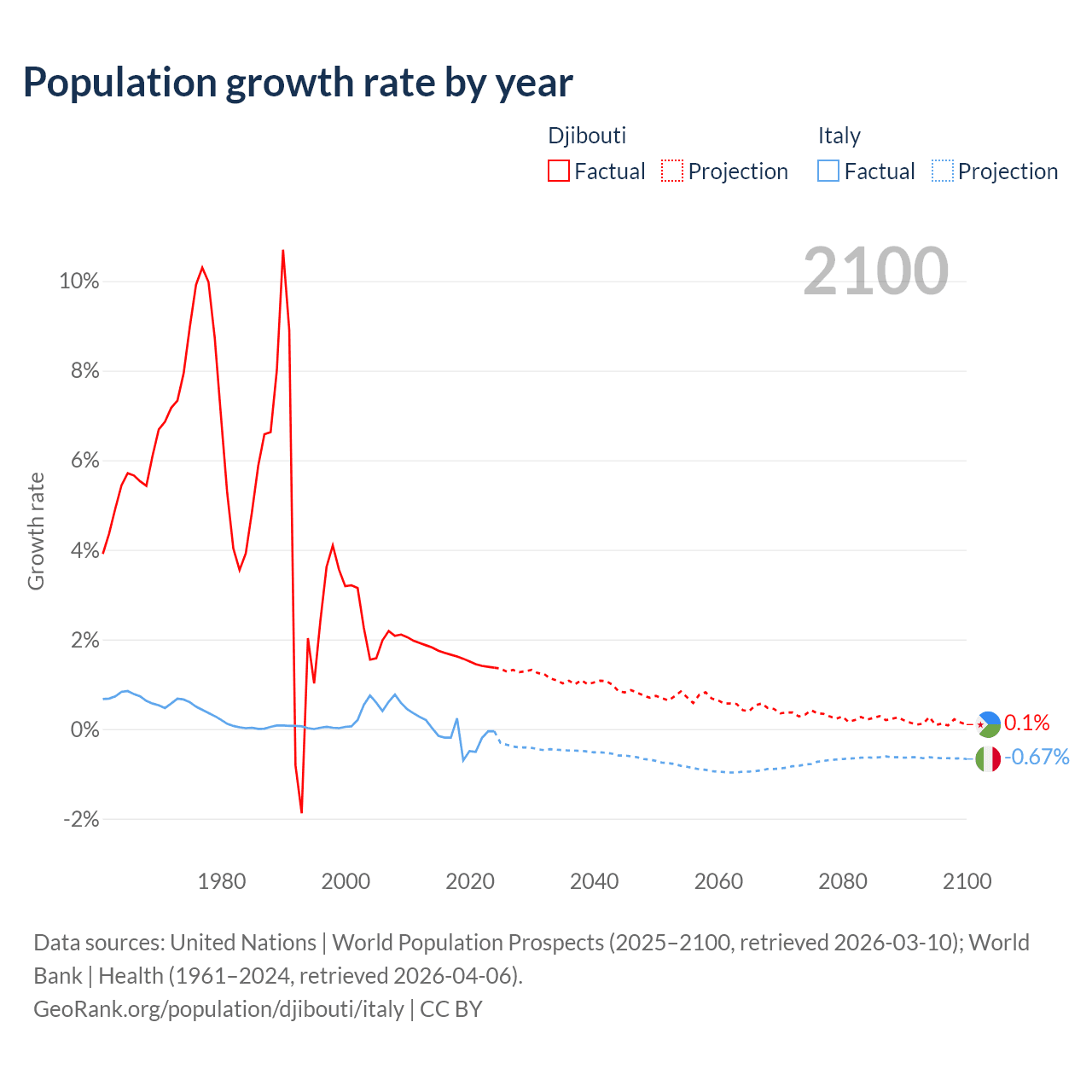 - For the last 10 years, Djibouti has had an average growth rate of +1.57% per year vs -0.21% in Italy.