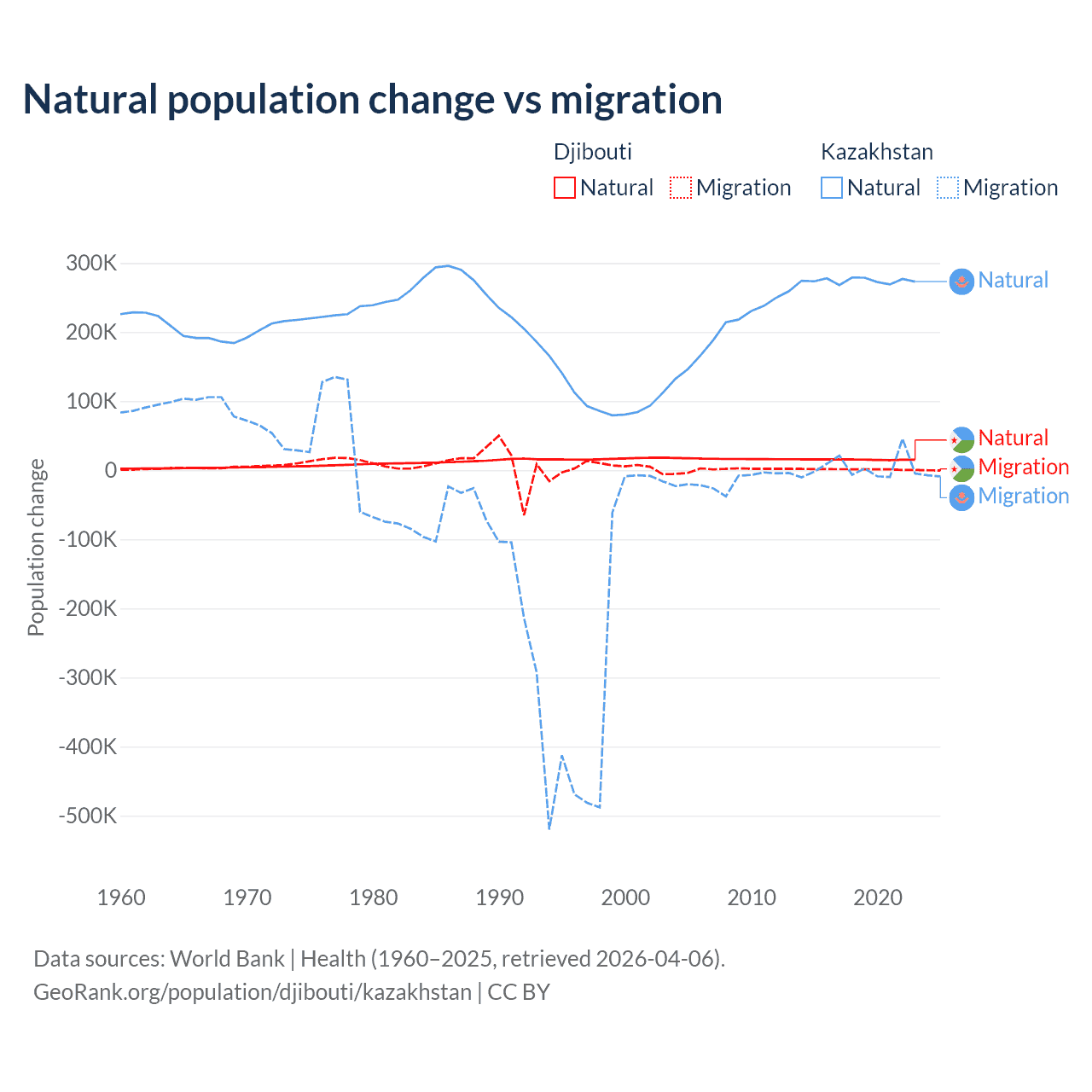 Over the last 10 years, 92.1% of the population change in Djibouti is from natural causes (a gain of 153,892 people) and 7.87% is from migration (a gain of 13,138 people). In Kazakhstan 98.7% is from natural causes (a gain of 2,743,094 people) and 1.33% is from migration (a gain of 36,908 people).