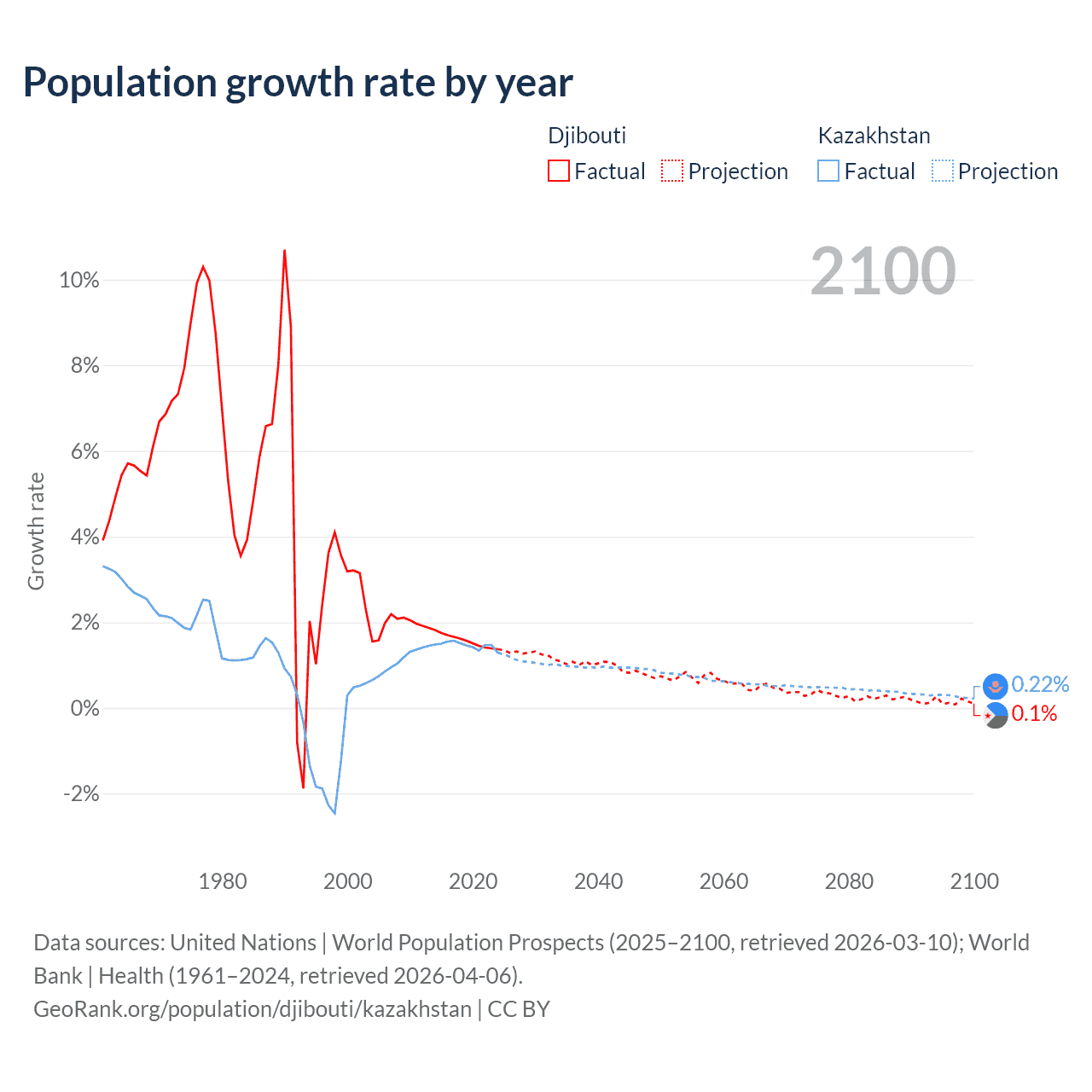 - For the last 10 years, Djibouti has had an average growth rate of +1.57% per year vs +1.46% in Kazakhstan.