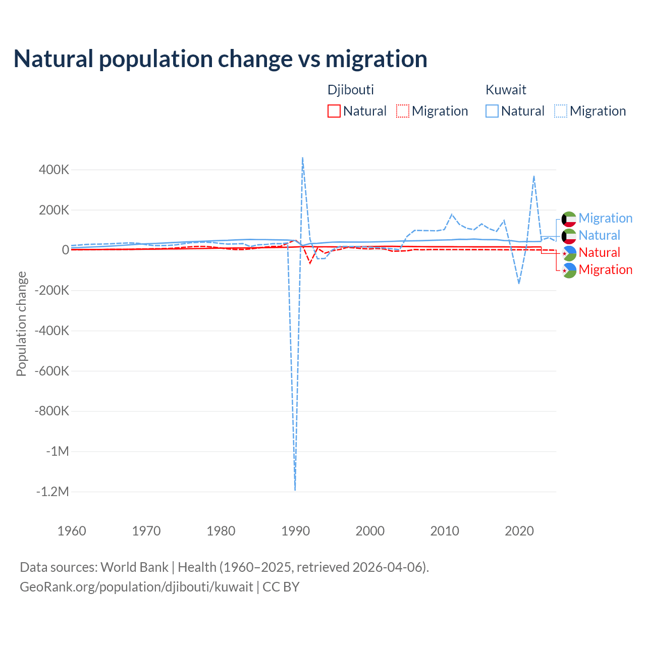 Over the last 10 years, 92.1% of the population change in Djibouti is from natural causes (a gain of 153,892 people) and 7.87% is from migration (a gain of 13,138 people). In Kuwait 35.8% is from natural causes (a gain of 470,645 people) and 64.2% is from migration (a gain of 845,142 people).