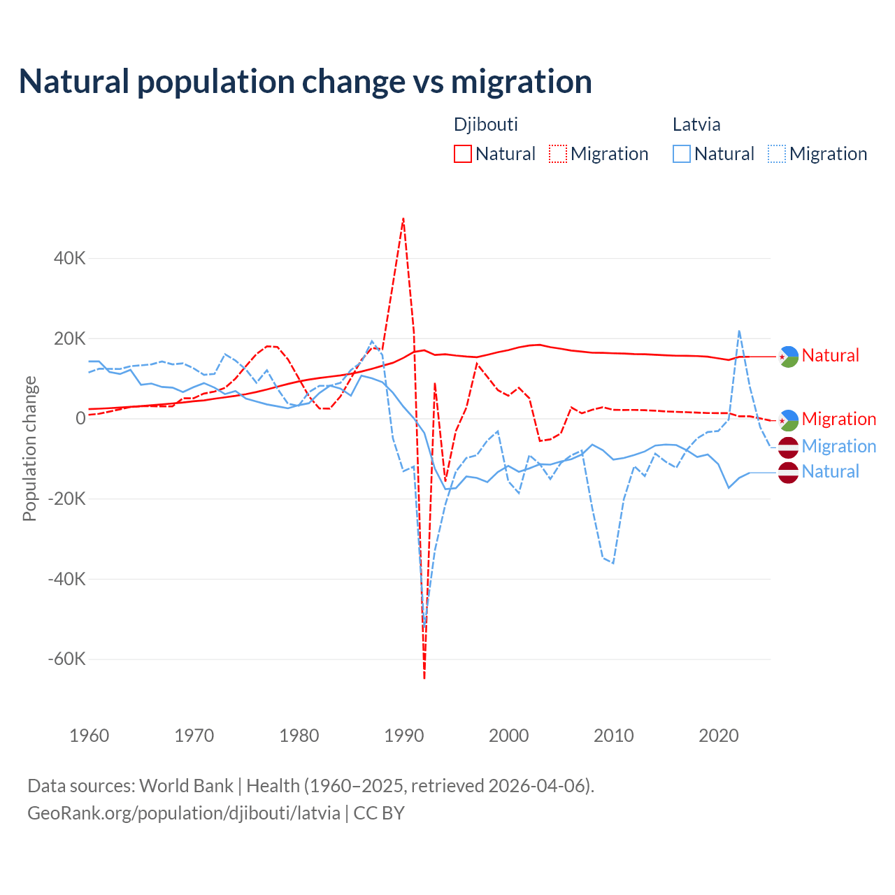 Over the last 10 years, 92.1% of the population change in Djibouti is from natural causes (a gain of 153,892 people) and 7.87% is from migration (a gain of 13,138 people). In Latvia 82.7% is from natural causes (a loss of 103,711 people) and 17.3% is from migration (a loss of 21,641 people).