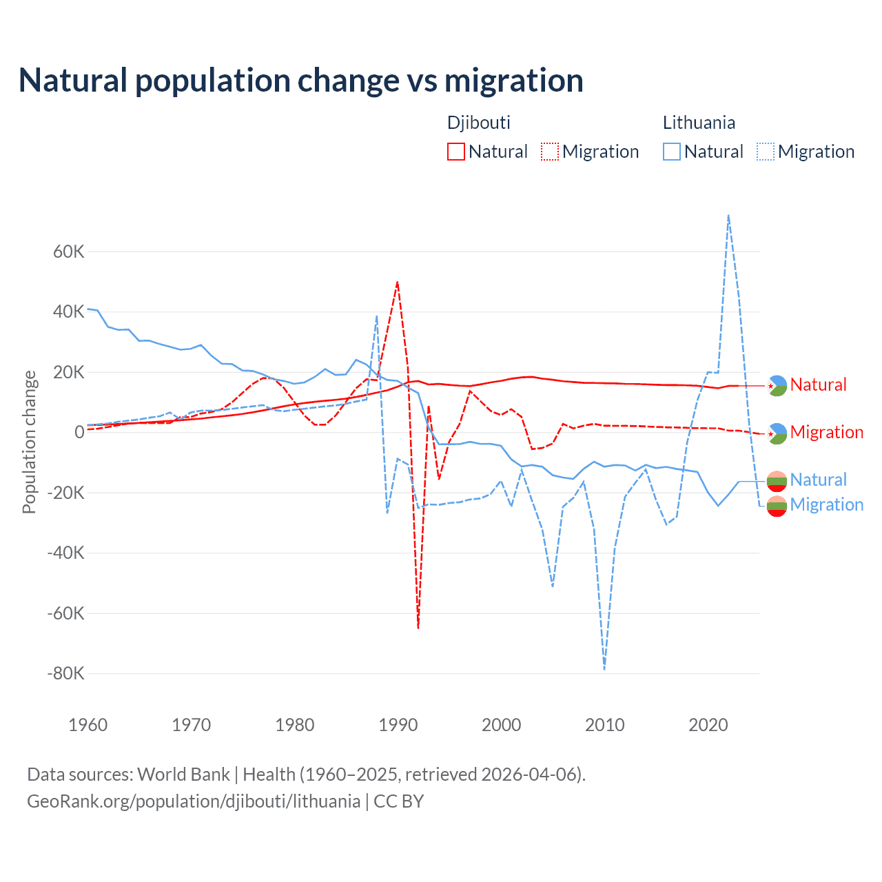 Over the last 10 years, 92.1% of the population change in Djibouti is from natural causes (a gain of 153,892 people) and 7.87% is from migration (a gain of 13,138 people). In Lithuania 68.7% is from natural causes (a loss of 153,859 people) and 31.3% is from migration (a gain of 70,196 people).