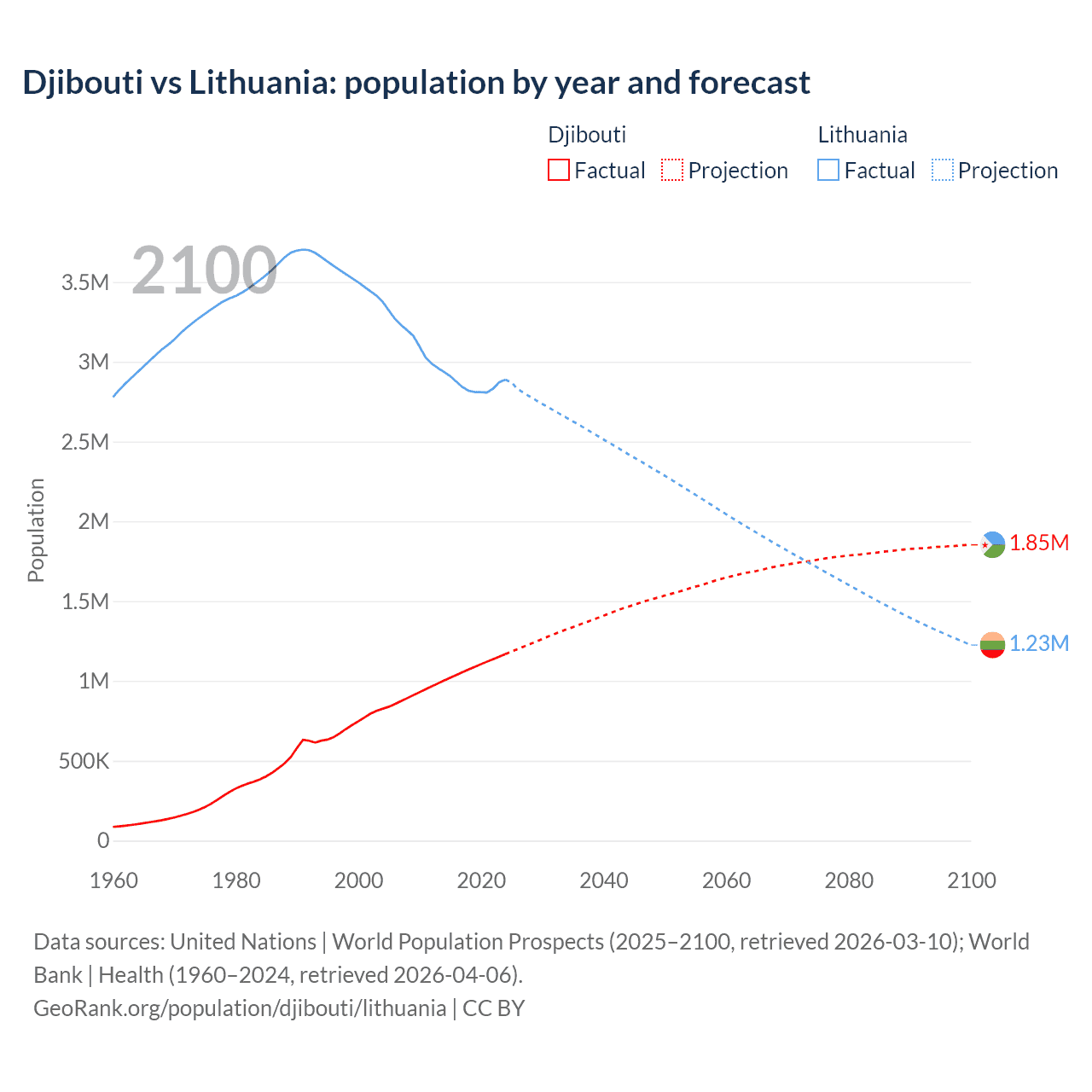 Djibouti vs Lithuania: population by year and forecast