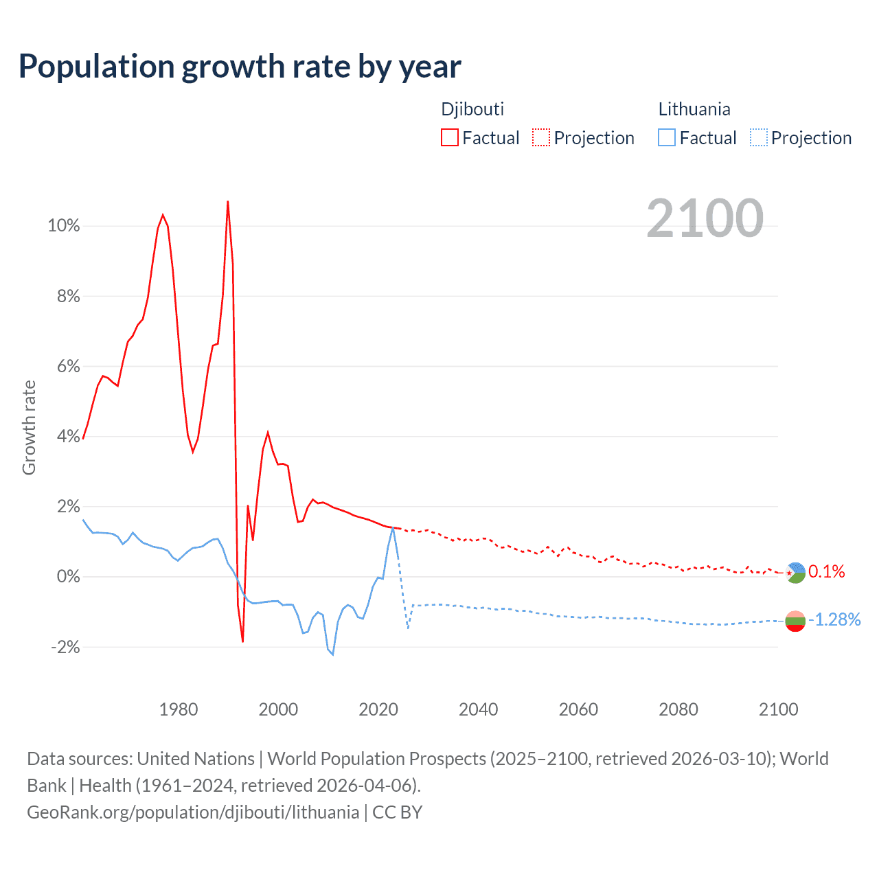 - For the last 10 years, Djibouti has had an average growth rate of +1.57% per year vs -0.22% in Lithuania.