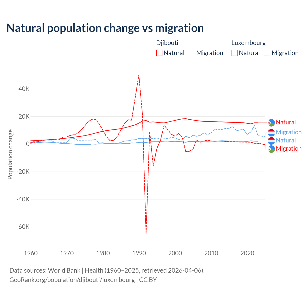 Over the last 10 years, 92.1% of the population change in Djibouti is from natural causes (a gain of 153,892 people) and 7.87% is from migration (a gain of 13,138 people). In Luxembourg 16.8% is from natural causes (a gain of 20,287 people) and 83.2% is from migration (a gain of 100,435 people).