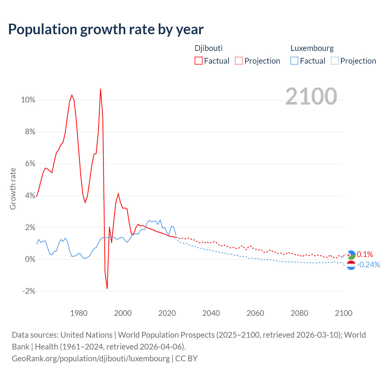 - For the last 10 years, Djibouti has had an average growth rate of +1.57% per year vs +2.02% in Luxembourg.