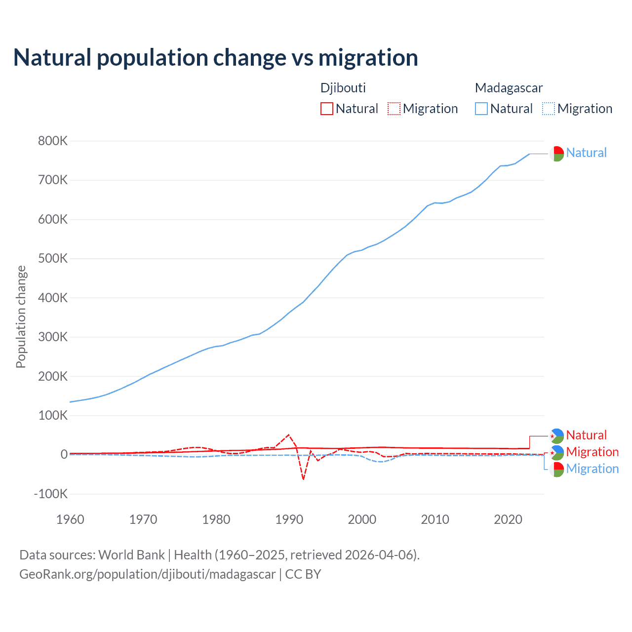 Over the last 10 years, 92.1% of the population change in Djibouti is from natural causes (a gain of 153,892 people) and 7.87% is from migration (a gain of 13,138 people). In Madagascar 99.7% is from natural causes (a gain of 7,165,578 people) and 0.31% is from migration (a loss of 22,384 people).