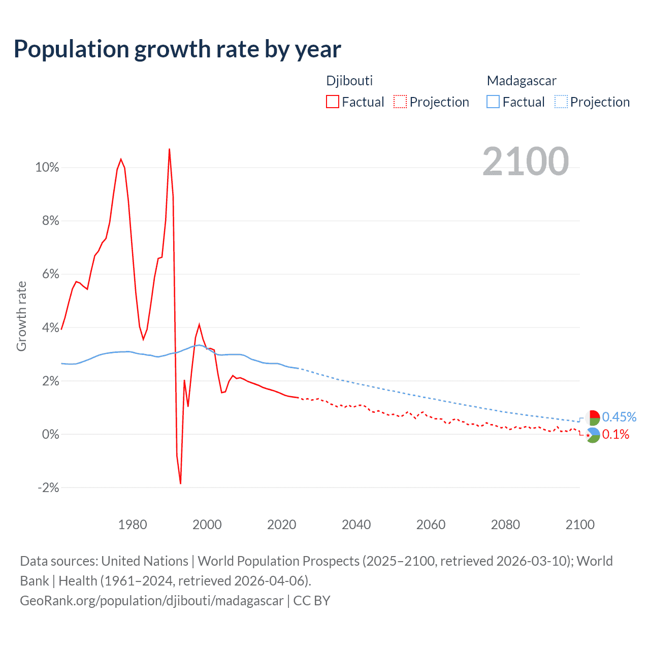 - For the last 10 years, Djibouti has had an average growth rate of +1.57% per year vs +2.6% in Madagascar.