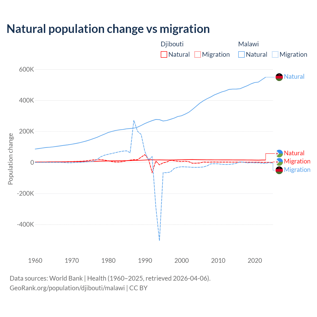 Over the last 10 years, 92.1% of the population change in Djibouti is from natural causes (a gain of 153,892 people) and 7.87% is from migration (a gain of 13,138 people). In Malawi 99.3% is from natural causes (a gain of 5,019,393 people) and 0.67% is from migration (a loss of 33,768 people).