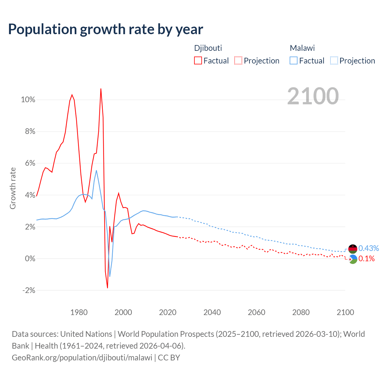- For the last 10 years, Djibouti has had an average growth rate of +1.57% per year vs +2.7% in Malawi.
