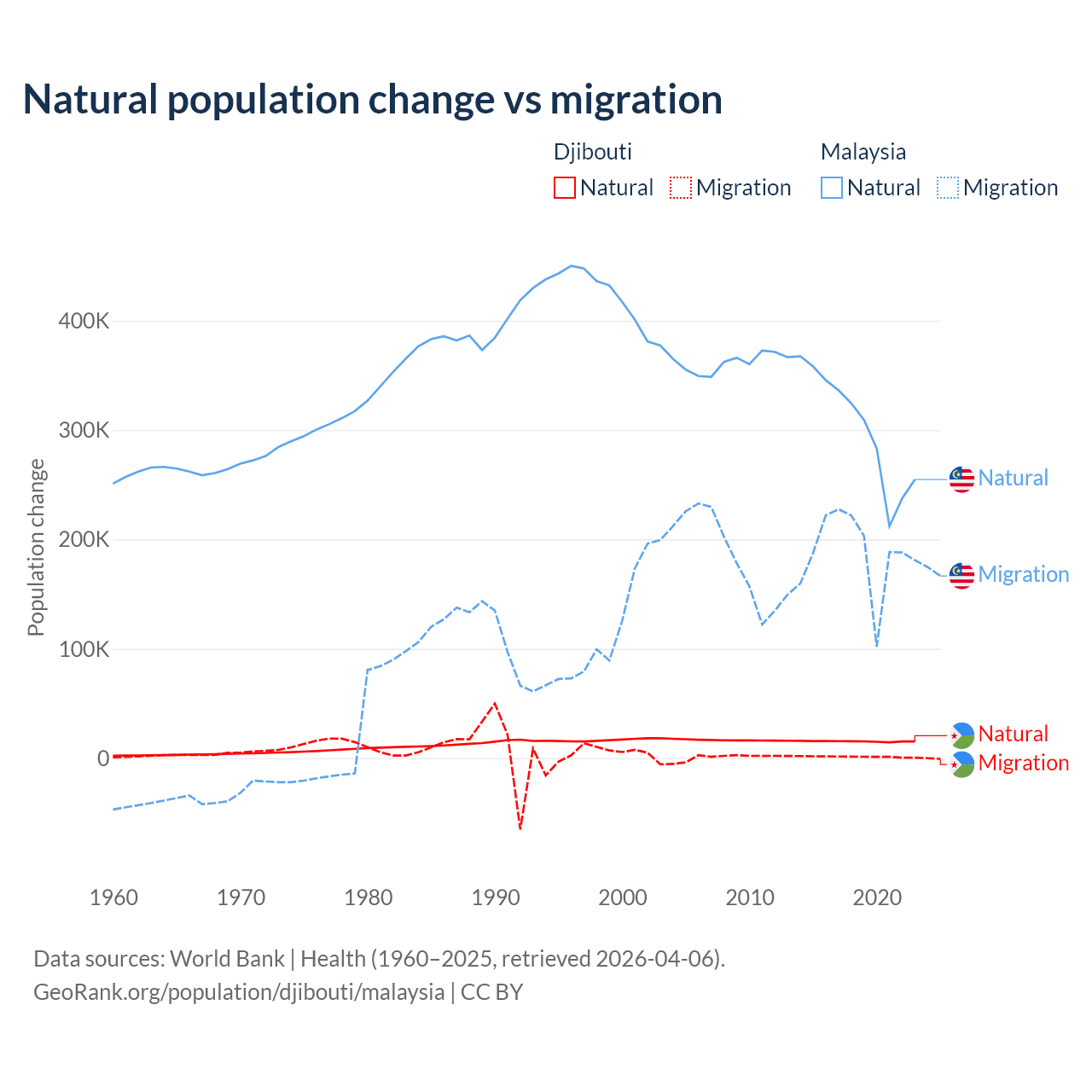 Over the last 10 years, 92.1% of the population change in Djibouti is from natural causes (a gain of 153,892 people) and 7.87% is from migration (a gain of 13,138 people). In Malaysia 61.7% is from natural causes (a gain of 3,029,648 people) and 38.3% is from migration (a gain of 1,882,159 people).