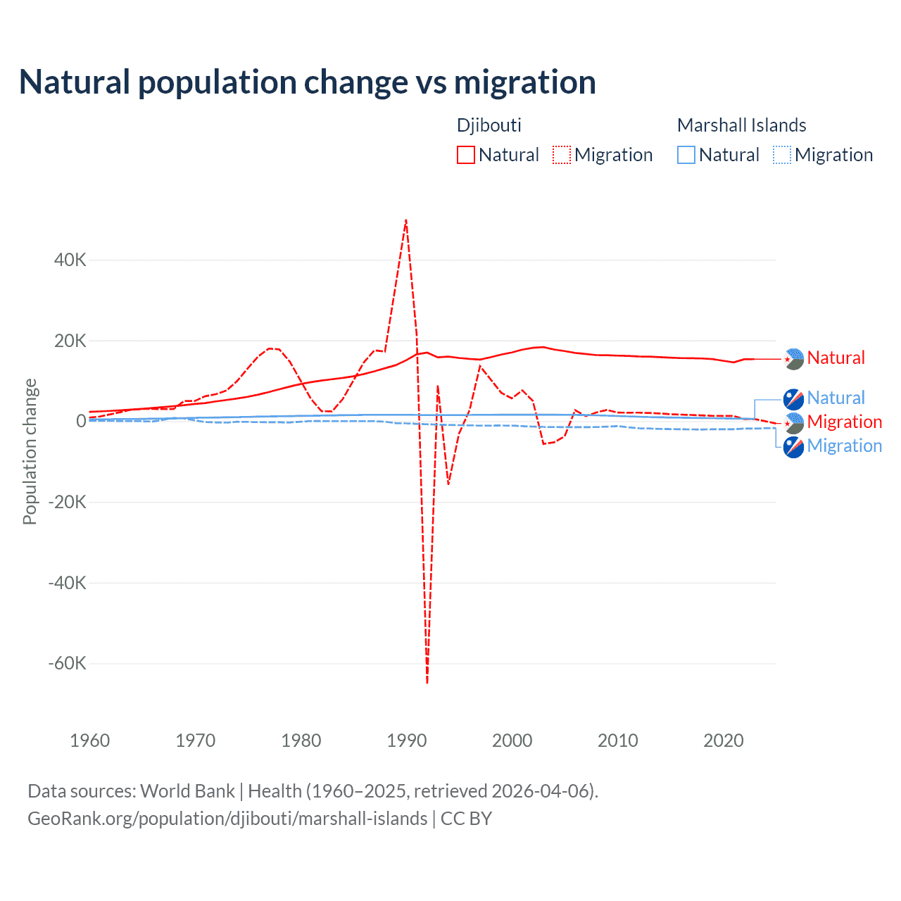 Over the last 10 years, 92.1% of the population change in Djibouti is from natural causes (a gain of 153,892 people) and 7.87% is from migration (a gain of 13,138 people). In the Marshall Islands 27.8% is from natural causes (a gain of 7,592 people) and 72.2% is from migration (a loss of 19,682 people).
