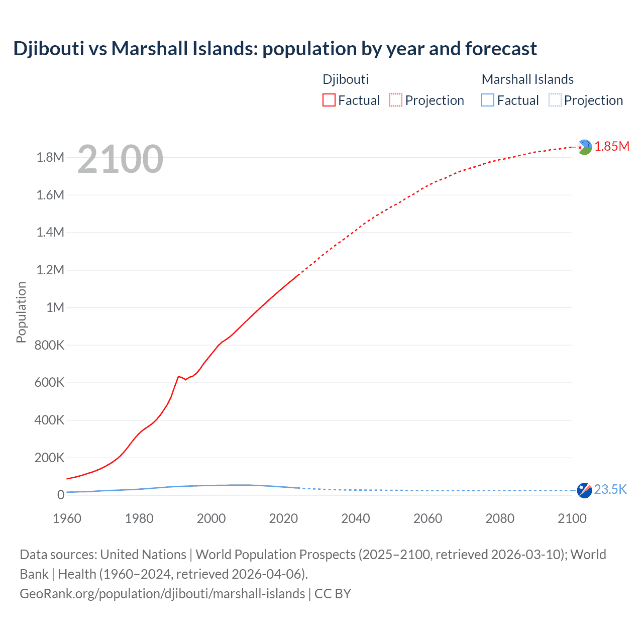 Djibouti vs Marshall Islands: population by year and forecast