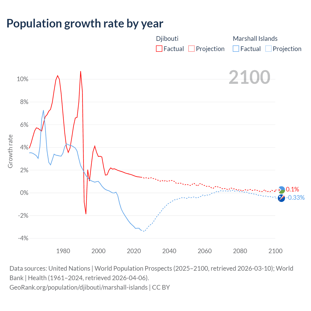 - For the last 10 years, Djibouti has had an average growth rate of +1.57% per year vs -2.69% in the Marshall Islands.
