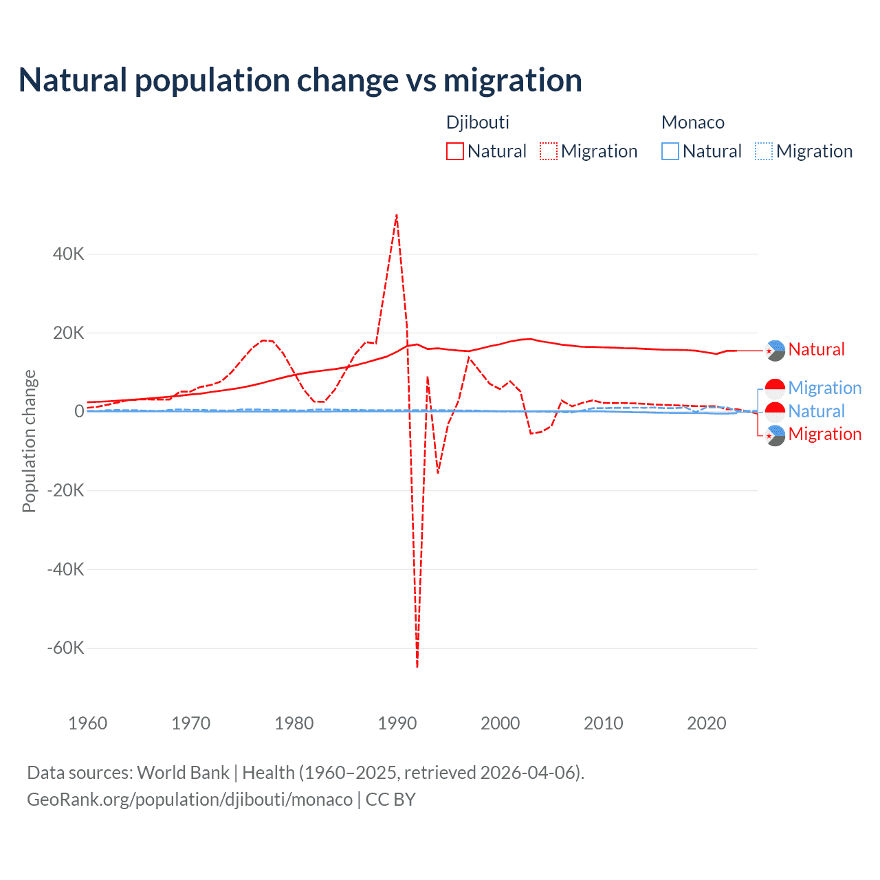 Over the last 10 years, 92.1% of the population change in Djibouti is from natural causes (a gain of 153,892 people) and 7.87% is from migration (a gain of 13,138 people). In Monaco 37.3% is from natural causes (a loss of 4,357 people) and 62.7% is from migration (a gain of 7,333 people).