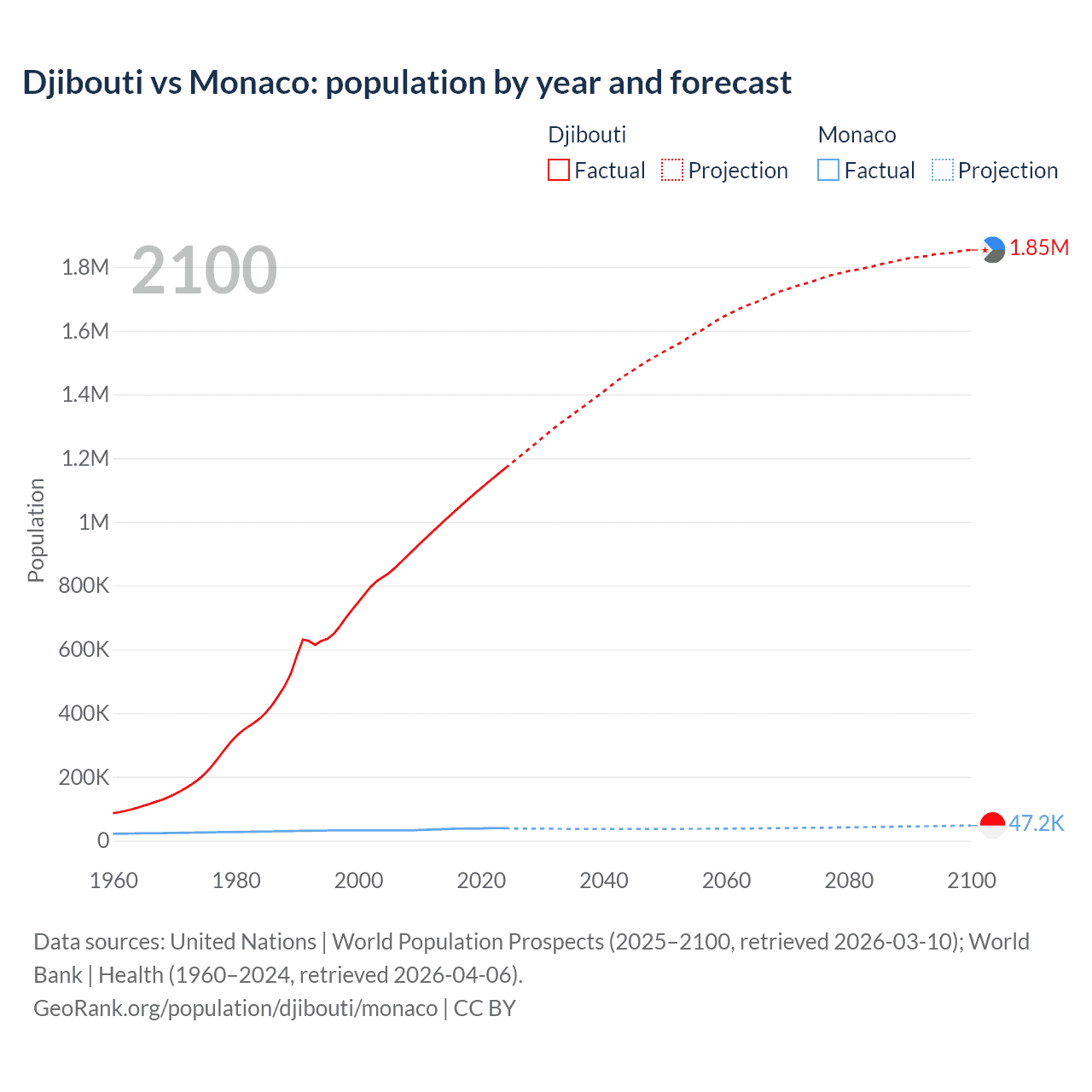 The latest officially reported population of Djibouti was 1,168,722 in 2024 vs 38,631 people in Monaco in 2024. In 2026, based on the adjusted UN estimation, the current Djibouti's population is 1,203,929 people compared to 38,053 in Monaco.