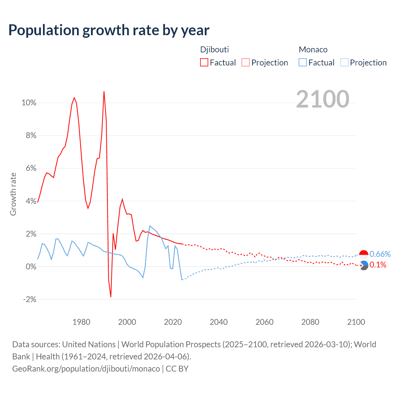 - For the last 10 years, Djibouti has had an average growth rate of +1.57% per year vs +0.79% in Monaco.