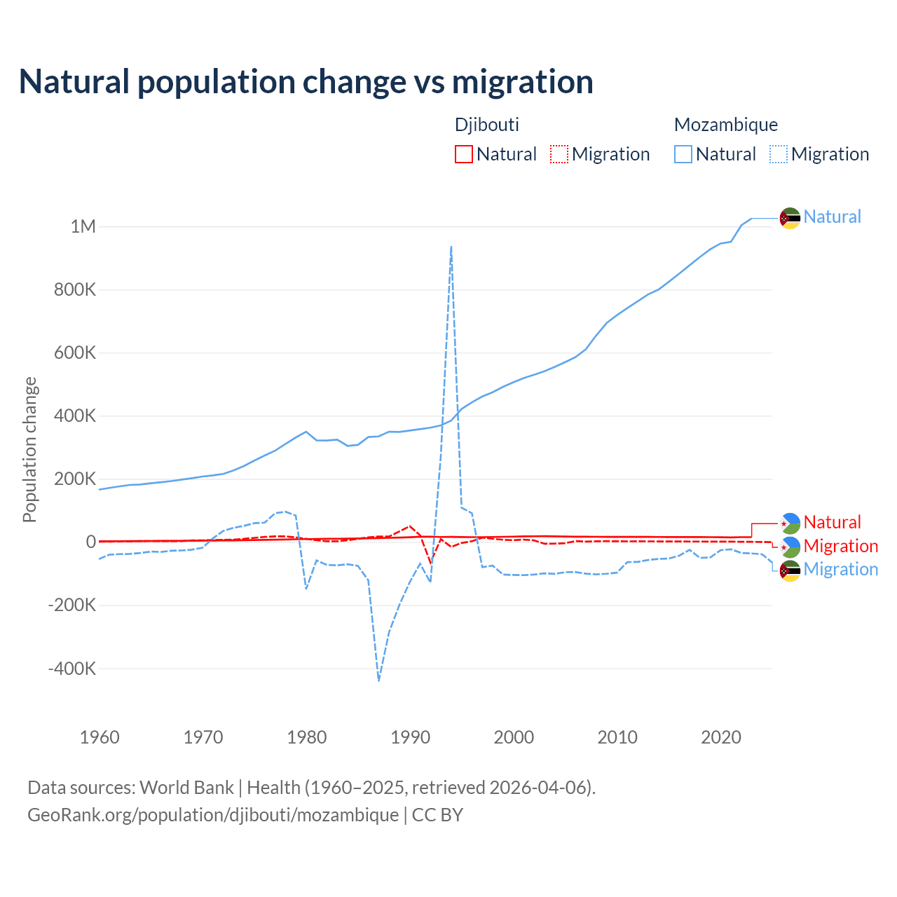 Over the last 10 years, 92.1% of the population change in Djibouti is from natural causes (a gain of 153,892 people) and 7.87% is from migration (a gain of 13,138 people). In Mozambique 95.9% is from natural causes (a gain of 9,108,203 people) and 4.15% is from migration (a loss of 393,923 people).