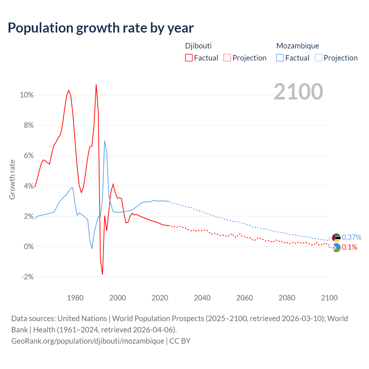 - For the last 10 years, Djibouti has had an average growth rate of +1.57% per year vs +2.99% in Mozambique.