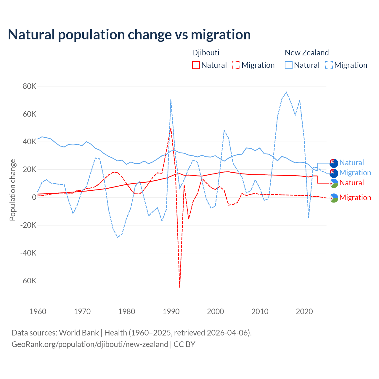 Over the last 10 years, 92.1% of the population change in Djibouti is from natural causes (a gain of 153,892 people) and 7.87% is from migration (a gain of 13,138 people). In New Zealand 34.4% is from natural causes (a gain of 247,767 people) and 65.6% is from migration (a gain of 471,602 people).