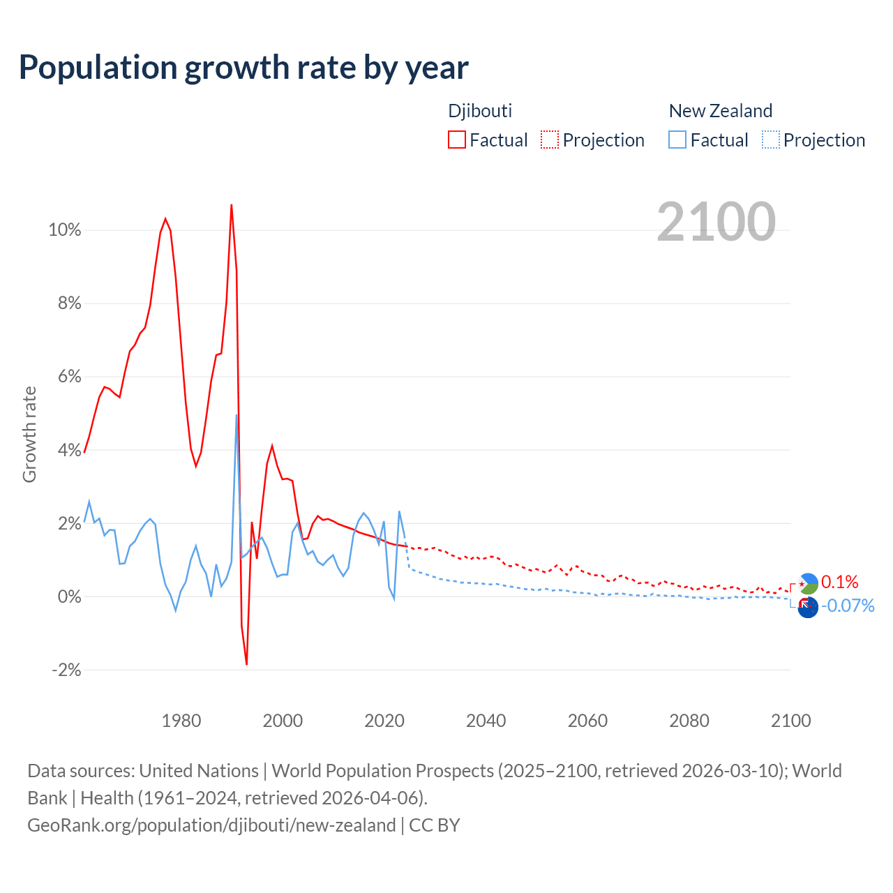 - For the last 10 years, Djibouti has had an average growth rate of +1.57% per year vs +1.6% in New Zealand.