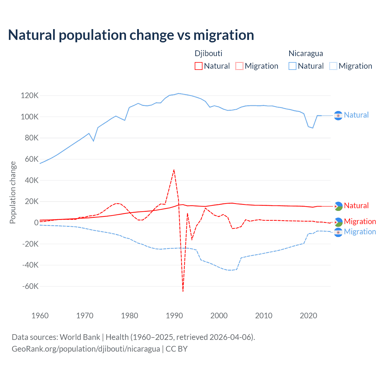 Over the last 10 years, 92.1% of the population change in Djibouti is from natural causes (a gain of 153,892 people) and 7.87% is from migration (a gain of 13,138 people). In Nicaragua 85.5% is from natural causes (a gain of 1,017,084 people) and 14.5% is from migration (a loss of 172,078 people).
