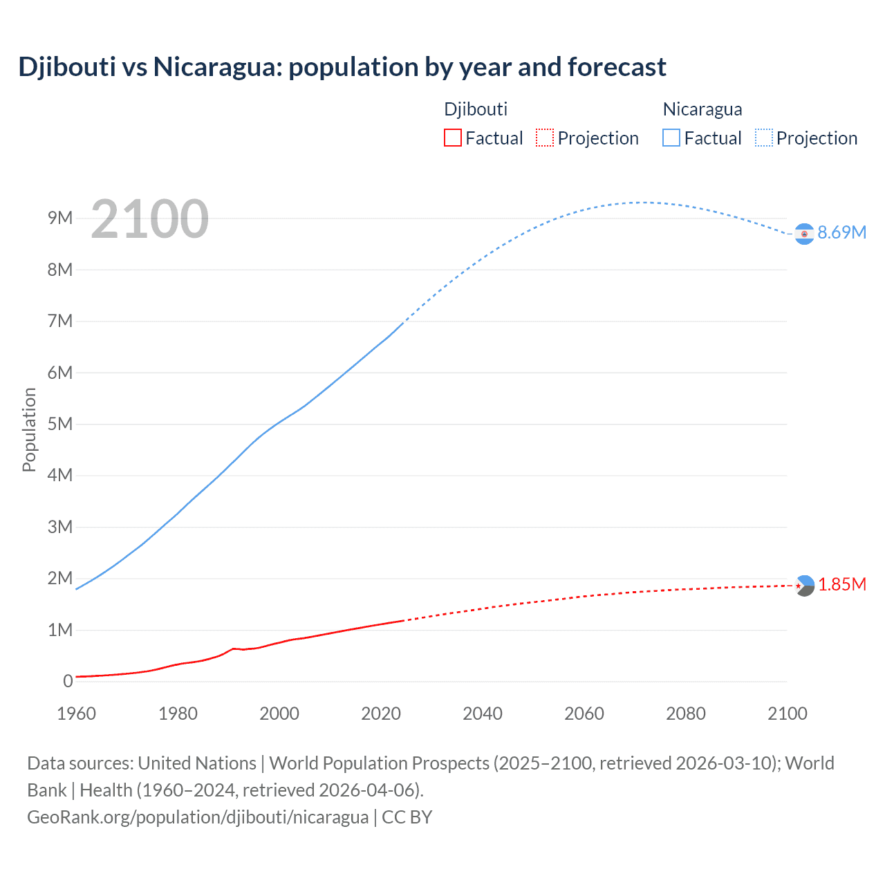 The latest officially reported population of Djibouti was 1,168,722 in 2024 vs 6,916,140 people in Nicaragua in 2024. In 2026, based on the adjusted UN estimation, the current Djibouti's population is 1,203,929 people compared to 7,124,343 in Nicaragua.