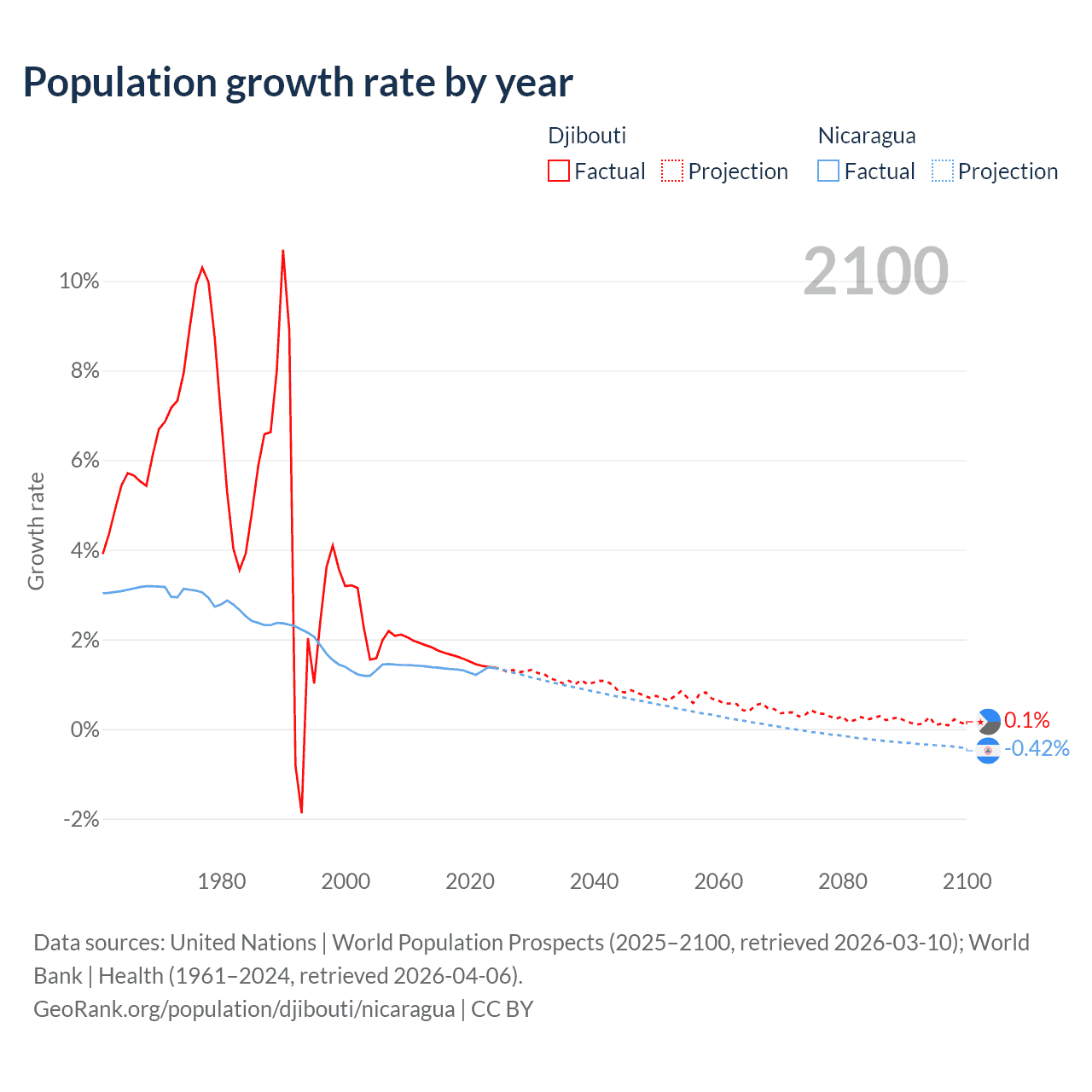 - For the last 10 years, Djibouti has had an average growth rate of +1.57% per year vs +1.33% in Nicaragua.
