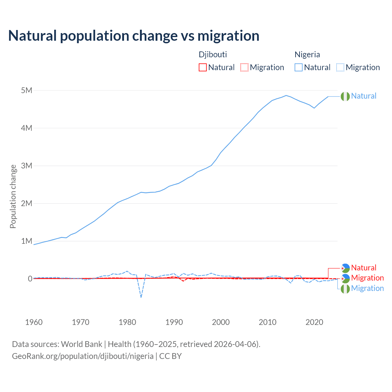 Over the last 10 years, 92.1% of the population change in Djibouti is from natural causes (a gain of 153,892 people) and 7.87% is from migration (a gain of 13,138 people). In Nigeria 99.2% is from natural causes (a gain of 47,163,517 people) and 0.77% is from migration (a loss of 368,103 people).
