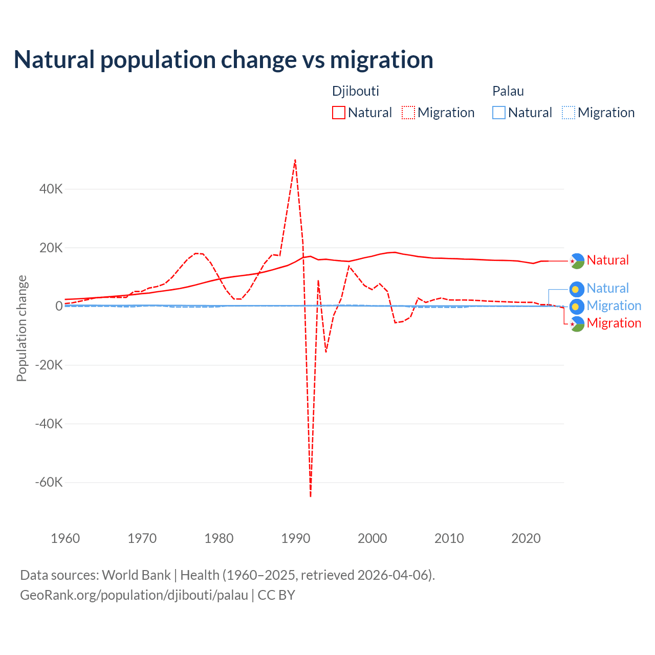 Over the last 10 years, 92.1% of the population change in Djibouti is from natural causes (a gain of 153,892 people) and 7.87% is from migration (a gain of 13,138 people). In Palau 53.8% is from natural causes (a gain of 264 people) and 46.2% is from migration (a loss of 227 people).