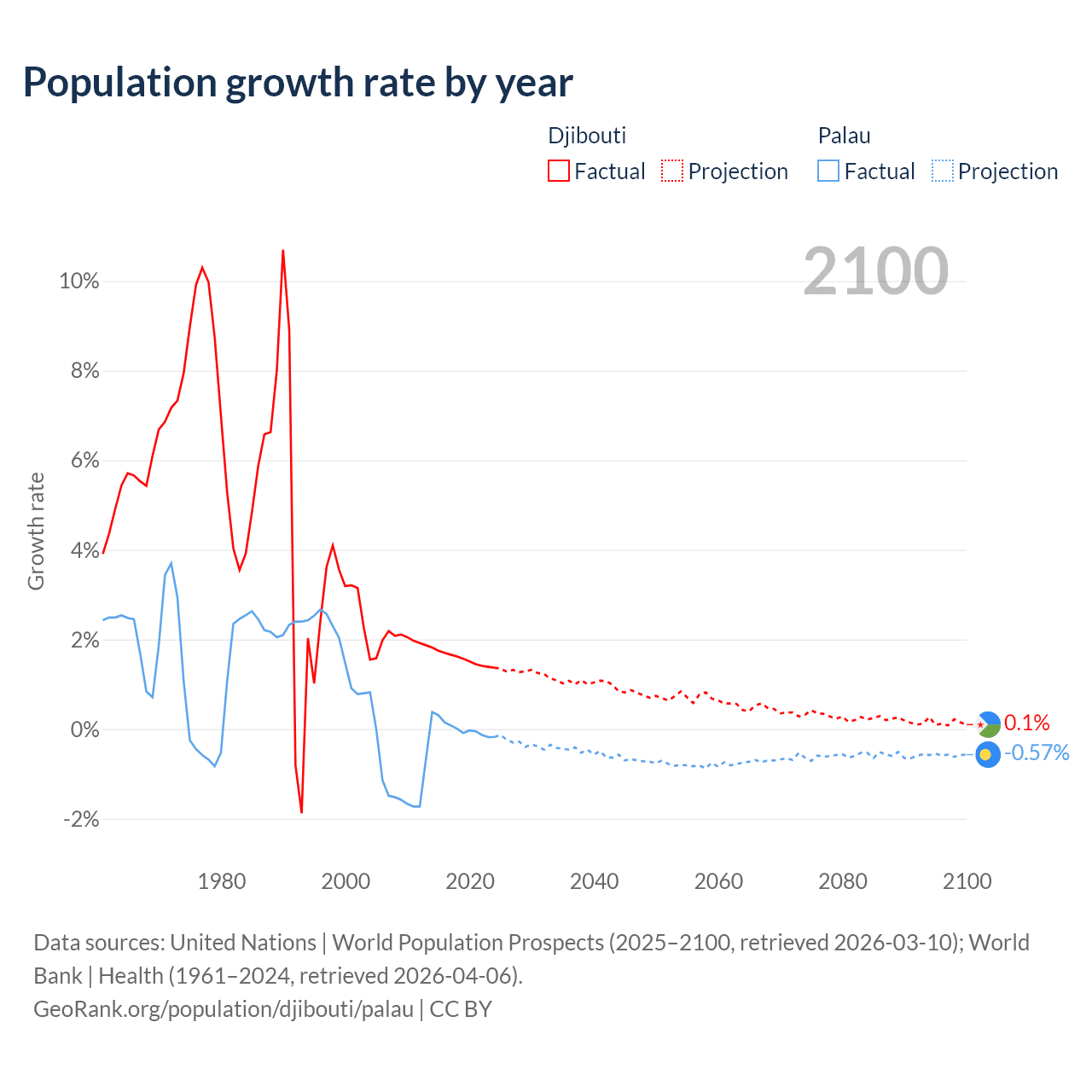 - For the last 10 years, Djibouti has had an average growth rate of +1.57% per year vs +0.02% in Palau.