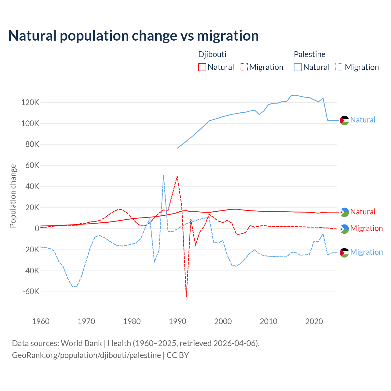 Over the last 10 years, 92.1% of the population change in Djibouti is from natural causes (a gain of 153,892 people) and 7.87% is from migration (a gain of 13,138 people). In Palestine 85.7% is from natural causes (a gain of 1,218,010 people) and 14.3% is from migration (a loss of 202,820 people).