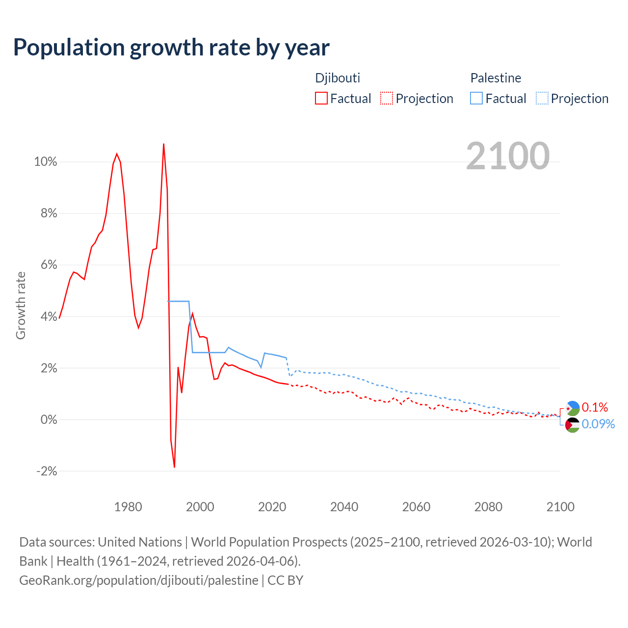 - For the last 10 years, Djibouti has had an average growth rate of +1.57% per year vs +2.4% in Palestine.