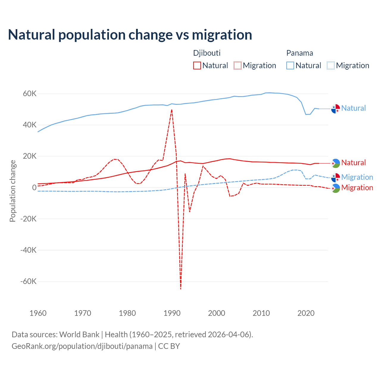 Over the last 10 years, 92.1% of the population change in Djibouti is from natural causes (a gain of 153,892 people) and 7.87% is from migration (a gain of 13,138 people). In Panama 86.5% is from natural causes (a gain of 544,211 people) and 13.5% is from migration (a gain of 84,849 people).