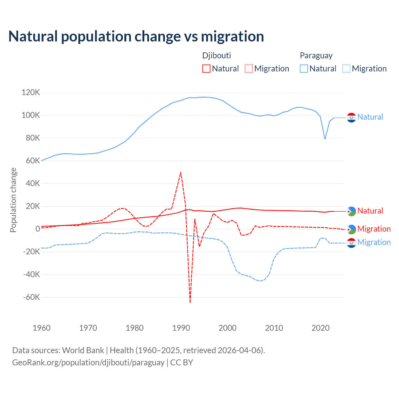 Over the last 10 years, 92.1% of the population change in Djibouti is from natural causes (a gain of 153,892 people) and 7.87% is from migration (a gain of 13,138 people). In Paraguay 87.6% is from natural causes (a gain of 1,002,636 people) and 12.4% is from migration (a loss of 141,377 people).