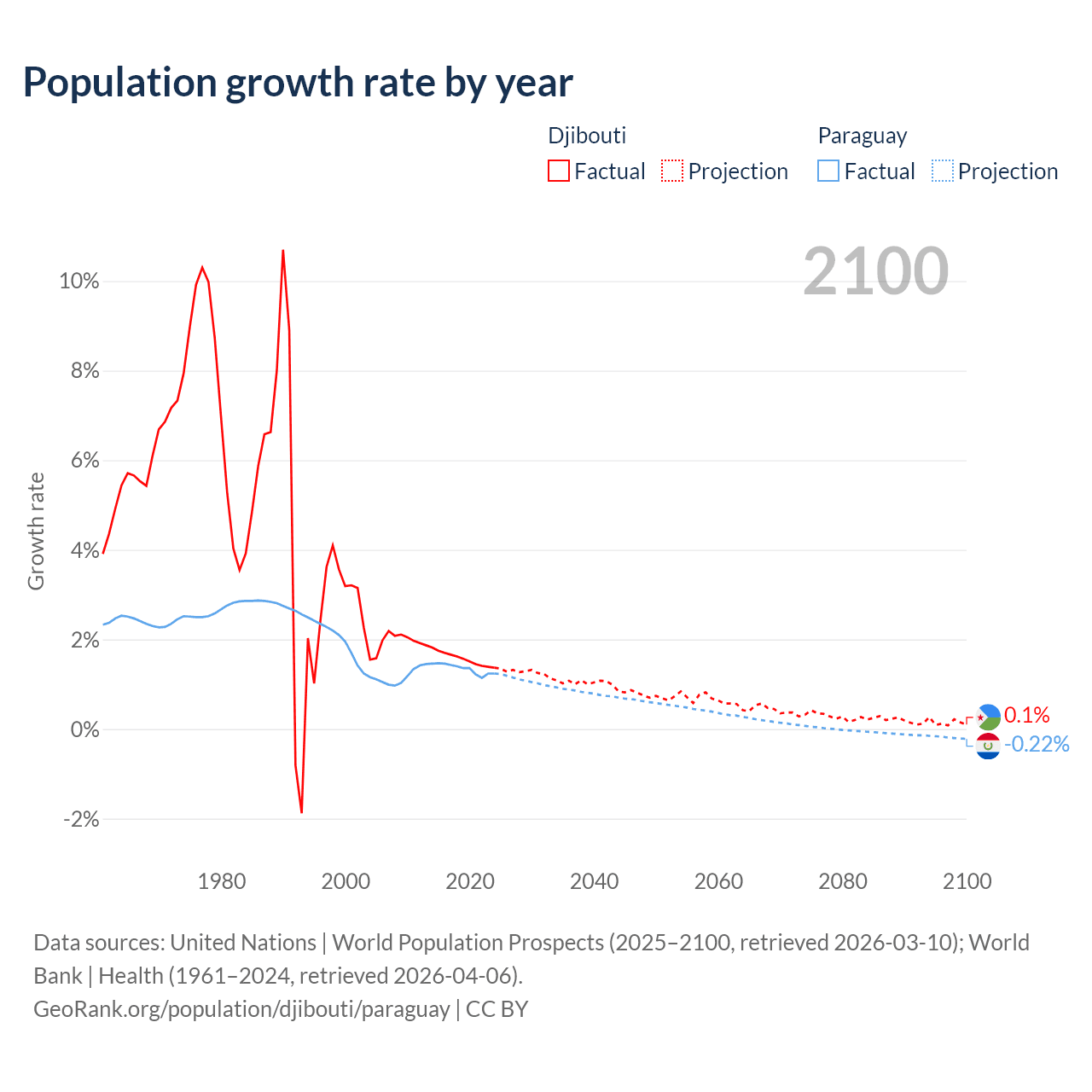 - For the last 10 years, Djibouti has had an average growth rate of +1.57% per year vs +1.34% in Paraguay.