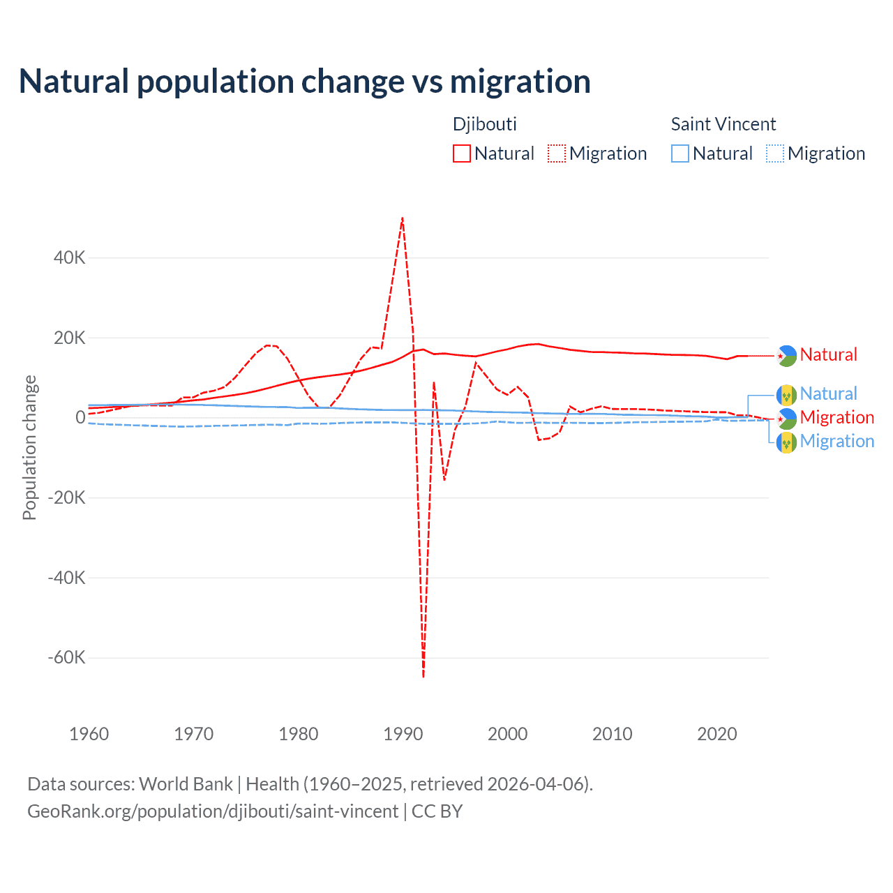 Over the last 10 years, 92.1% of the population change in Djibouti is from natural causes (a gain of 153,892 people) and 7.87% is from migration (a gain of 13,138 people). In Saint Vincent 21.2% is from natural causes (a gain of 2,525 people) and 78.8% is from migration (a loss of 9,393 people).