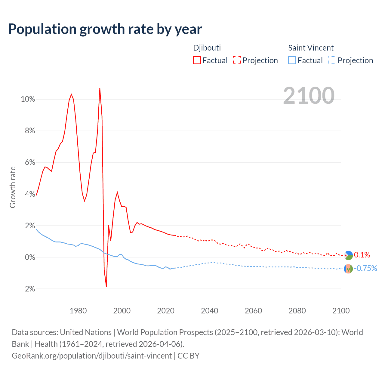 - For the last 10 years, Djibouti has had an average growth rate of +1.57% per year vs -0.65% in Saint Vincent.
