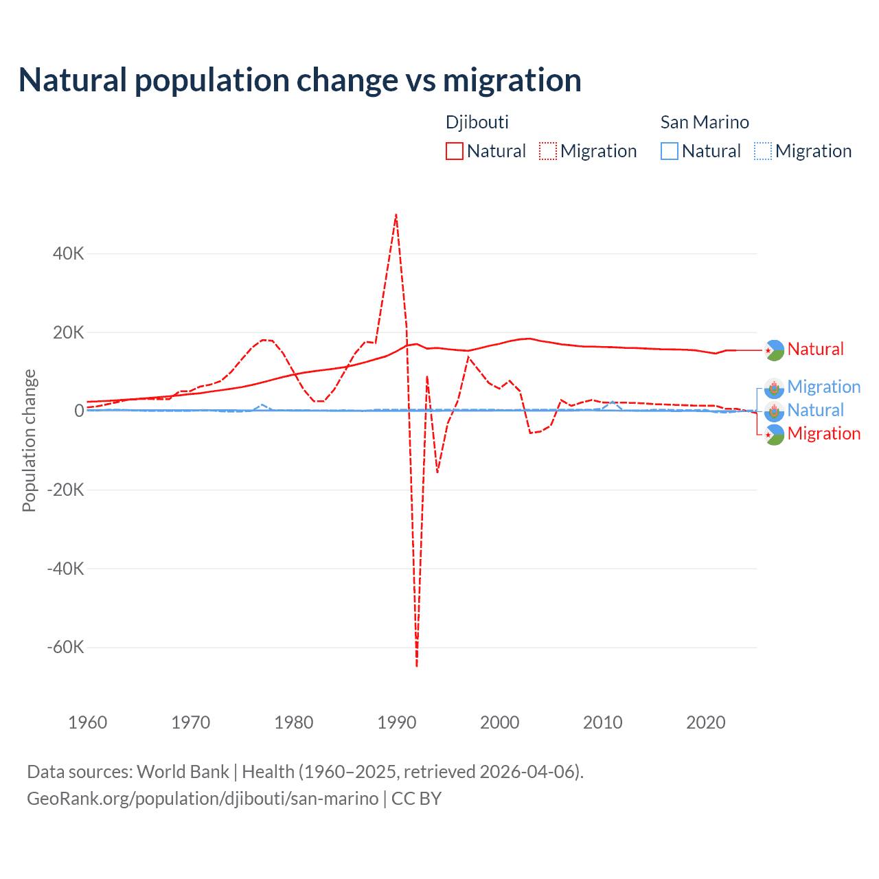 Over the last 10 years, 92.1% of the population change in Djibouti is from natural causes (a gain of 153,892 people) and 7.87% is from migration (a gain of 13,138 people). In San Marino 40.9% is from natural causes (a loss of 358 people) and 59.1% is from migration (a gain of 517 people).