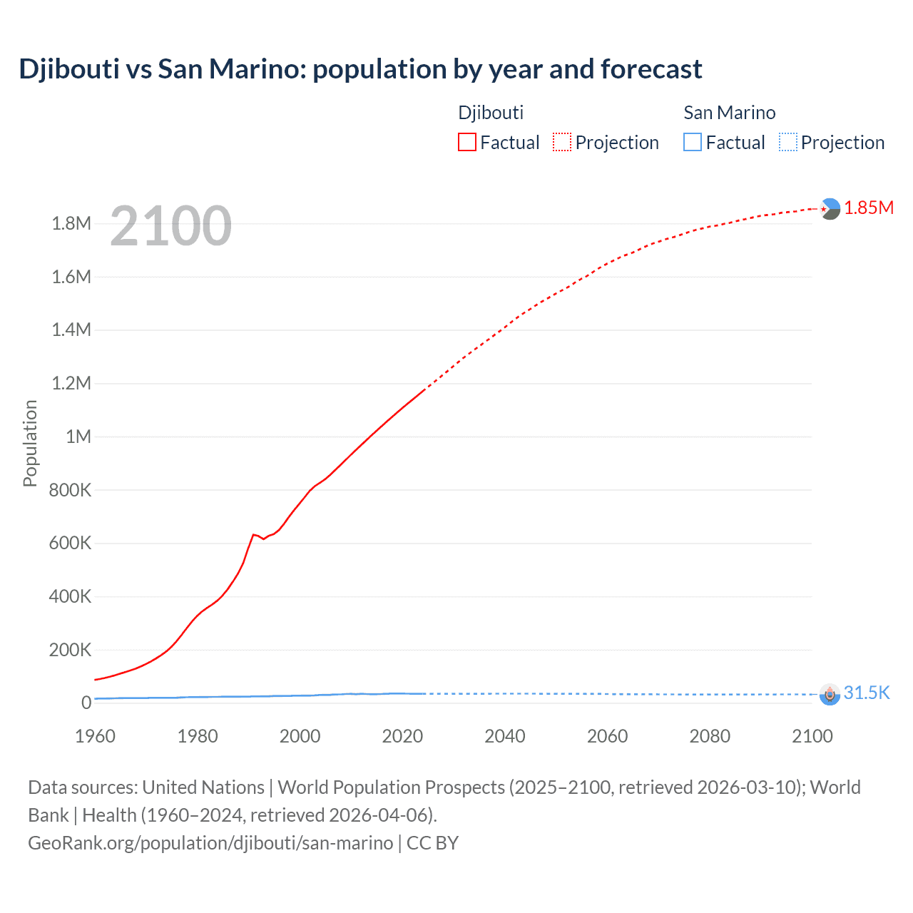 - Djibouti's population is 35.4 times bigger than San Marino's.
