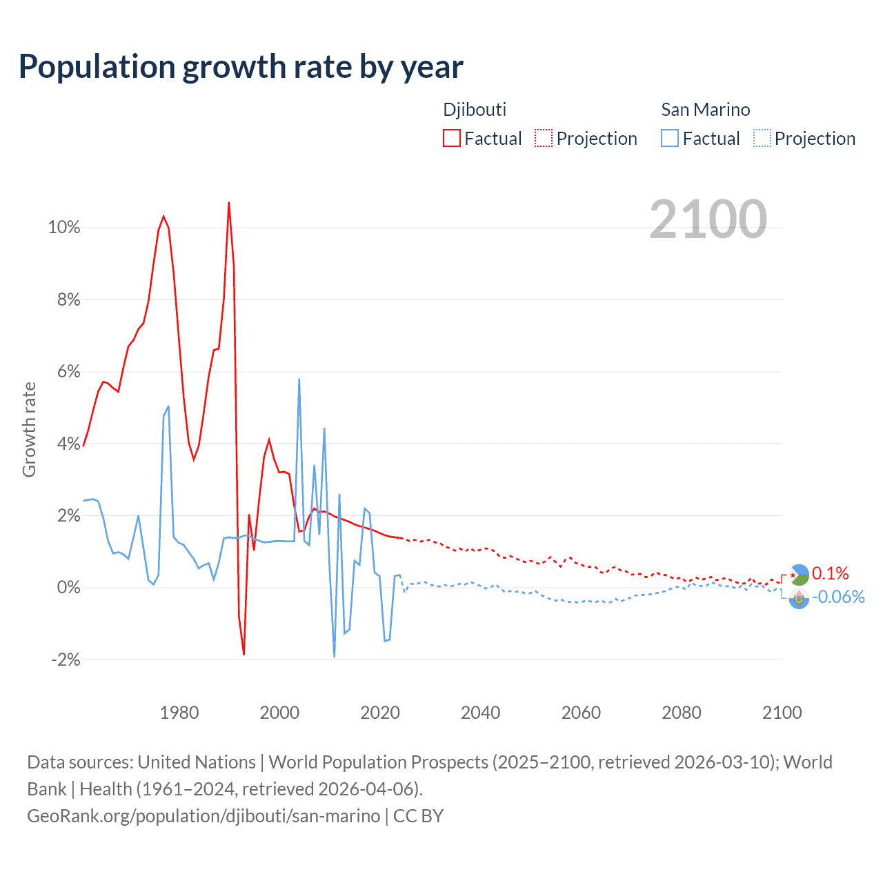 - For the last 10 years, Djibouti has had an average growth rate of +1.57% per year vs +0.26% in San Marino.