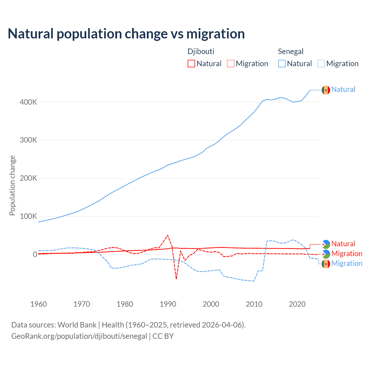 Over the last 10 years, 92.1% of the population change in Djibouti is from natural causes (a gain of 153,892 people) and 7.87% is from migration (a gain of 13,138 people). In Senegal 93.9% is from natural causes (a gain of 4,089,205 people) and 6.13% is from migration (a gain of 267,266 people).