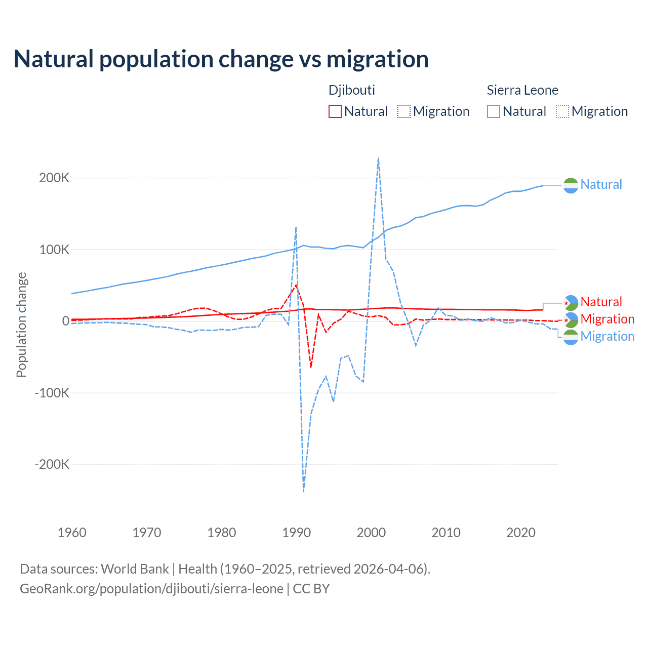 Over the last 10 years, 92.1% of the population change in Djibouti is from natural causes (a gain of 153,892 people) and 7.87% is from migration (a gain of 13,138 people). In Sierra Leone 99.6% is from natural causes (a gain of 1,764,049 people) and 0.41% is from migration (a loss of 7,211 people).